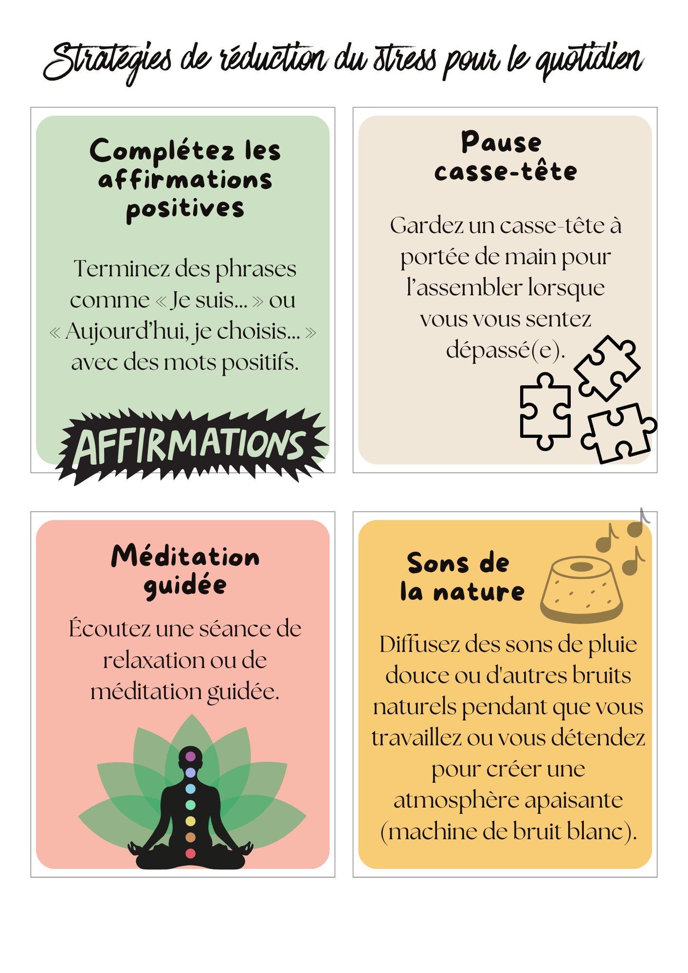L’outil « Les règles de base pour diminuer le stress » a été conçu pour aider les jeunes et les adultes à mieux comprendre le stress, à le différencier de l’anxiété et à développer des stratégies concrètes pour l’apaiser.