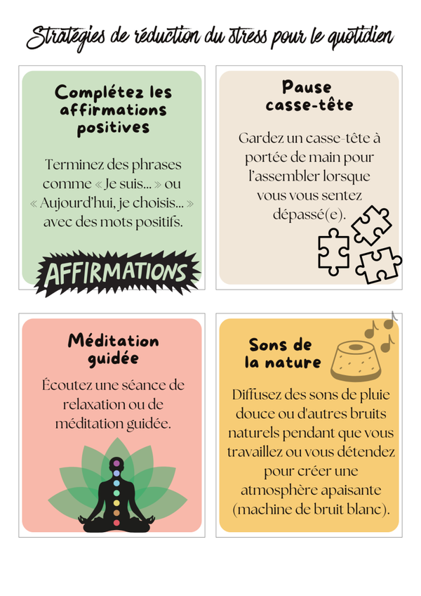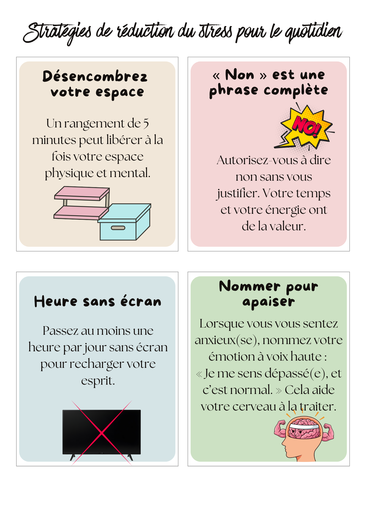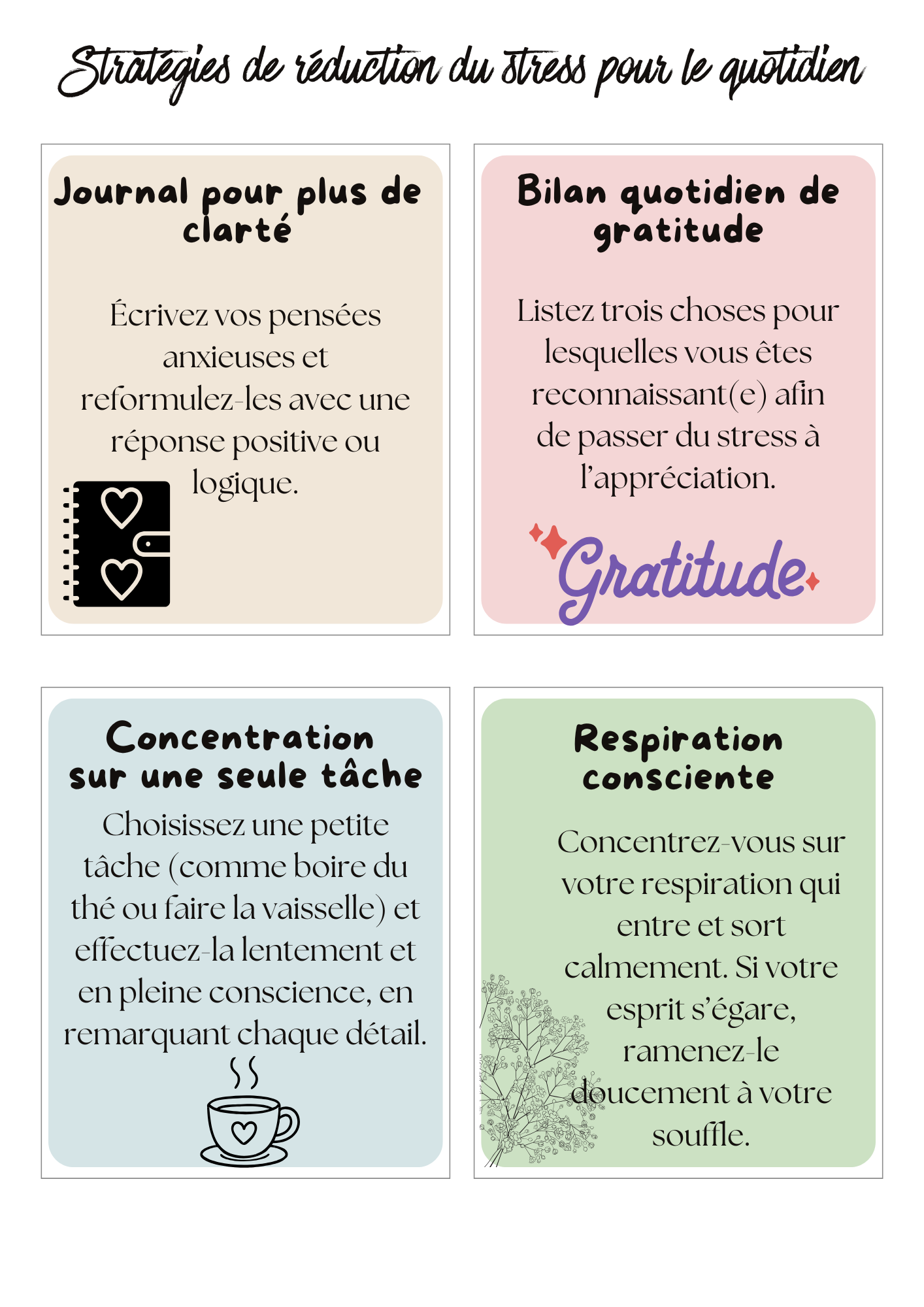 À travers des explications simples, des activités de réflexion et des défis pratiques, cet outil permet de reprendre du pouvoir sur son stress et d’intégrer des habitudes plus équilibrées.