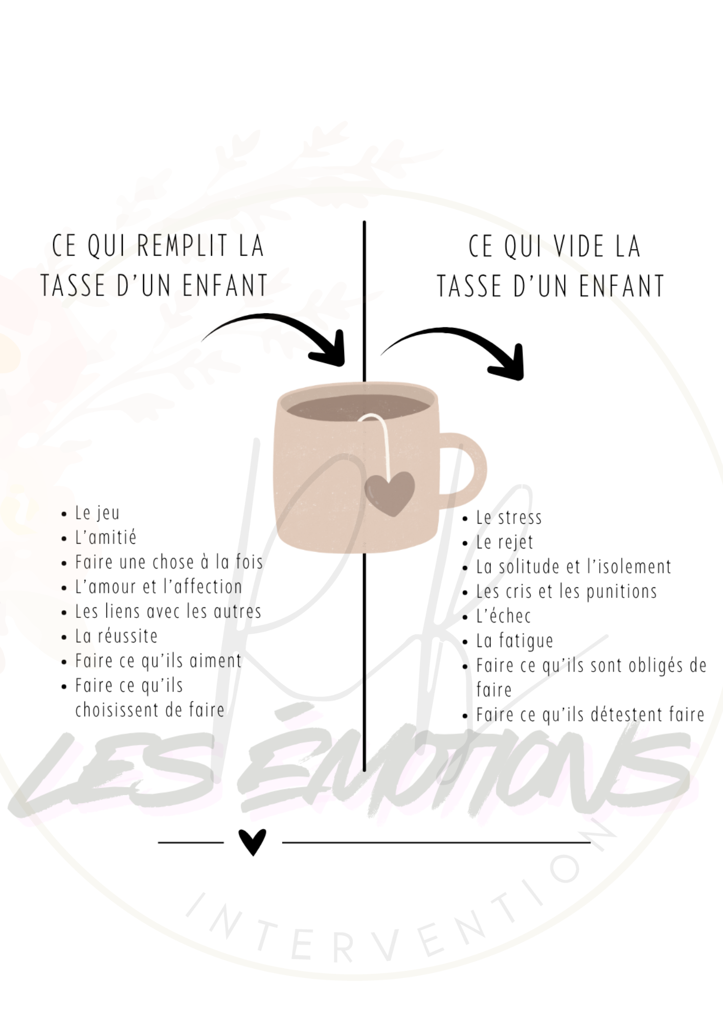 La tasse des émotions est un outil psychoéducatif conçu pour aider les enfants, les adolescents et les adultes à mieux comprendre leur monde émotionnel. À l’image d’une tasse qui se remplit, cet outil permet de visualiser l’accumulation des émotions et de prendre conscience du moment où elles débordent.